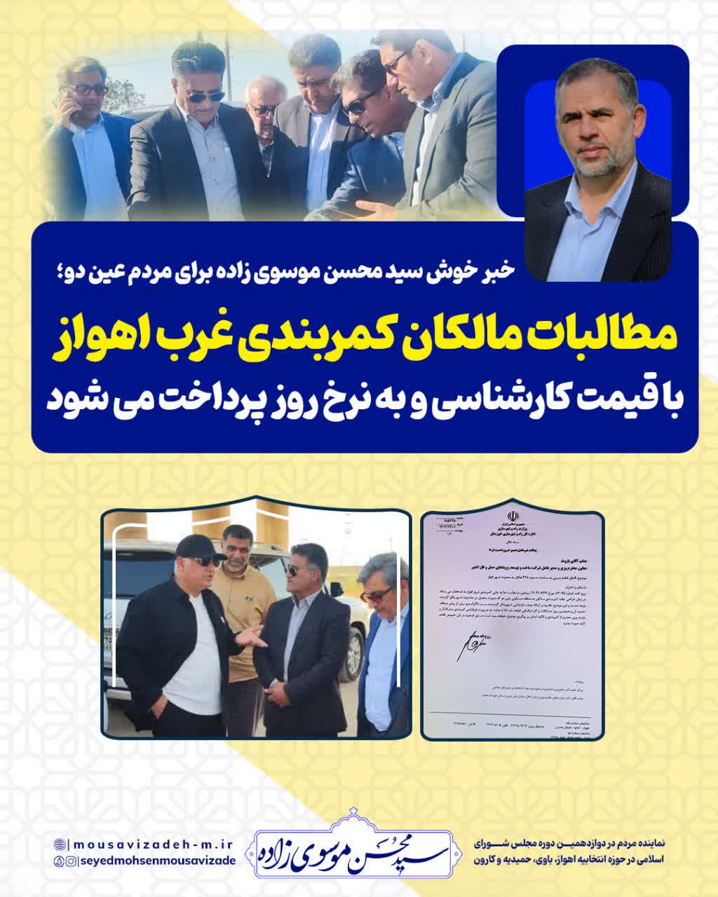 خبر خوش سید محسن موسوی زاده برای مردم عین دو؛ مطالبات مالکان کمربندی غرب اهواز تامین شد/ مطالبات با قیمت کارشناسی و به نرخ روز پرداخت می شود