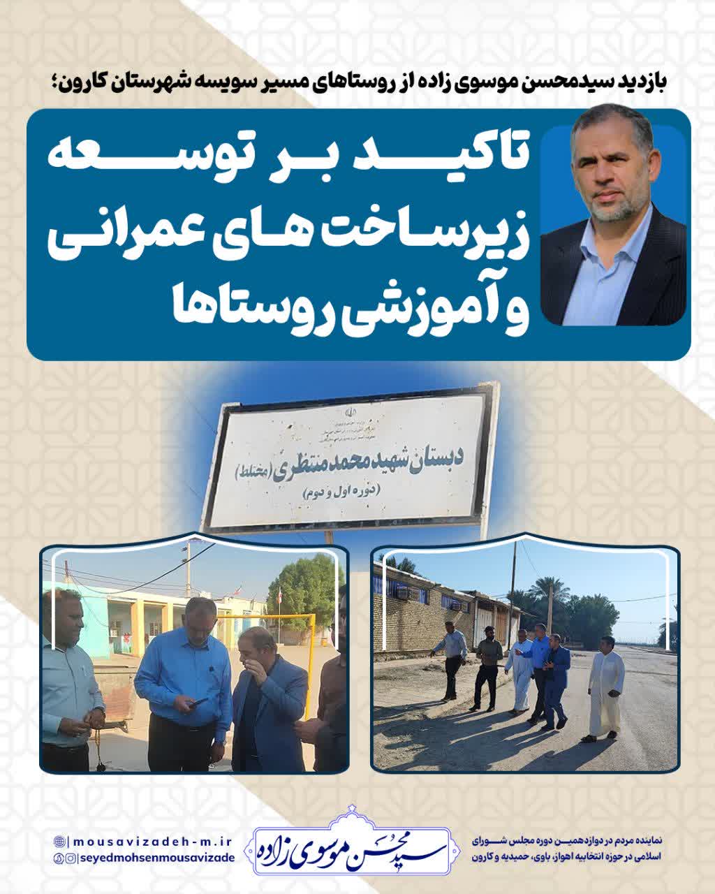 به گزارش شیرین خبر از روابط عمومی دفتر نماینده اهواز، باوی، حمیدیه و کارون در مجلس شورای اسلامی پیرو مطالبات مردمی، سید محسن موسوی زاده با حضور در شهرستان کارون از پروژه های عمرانی روستایی بازدید و مشکلات این روستاها را مورد بررسی و در دستور پیگیری قرار داد.