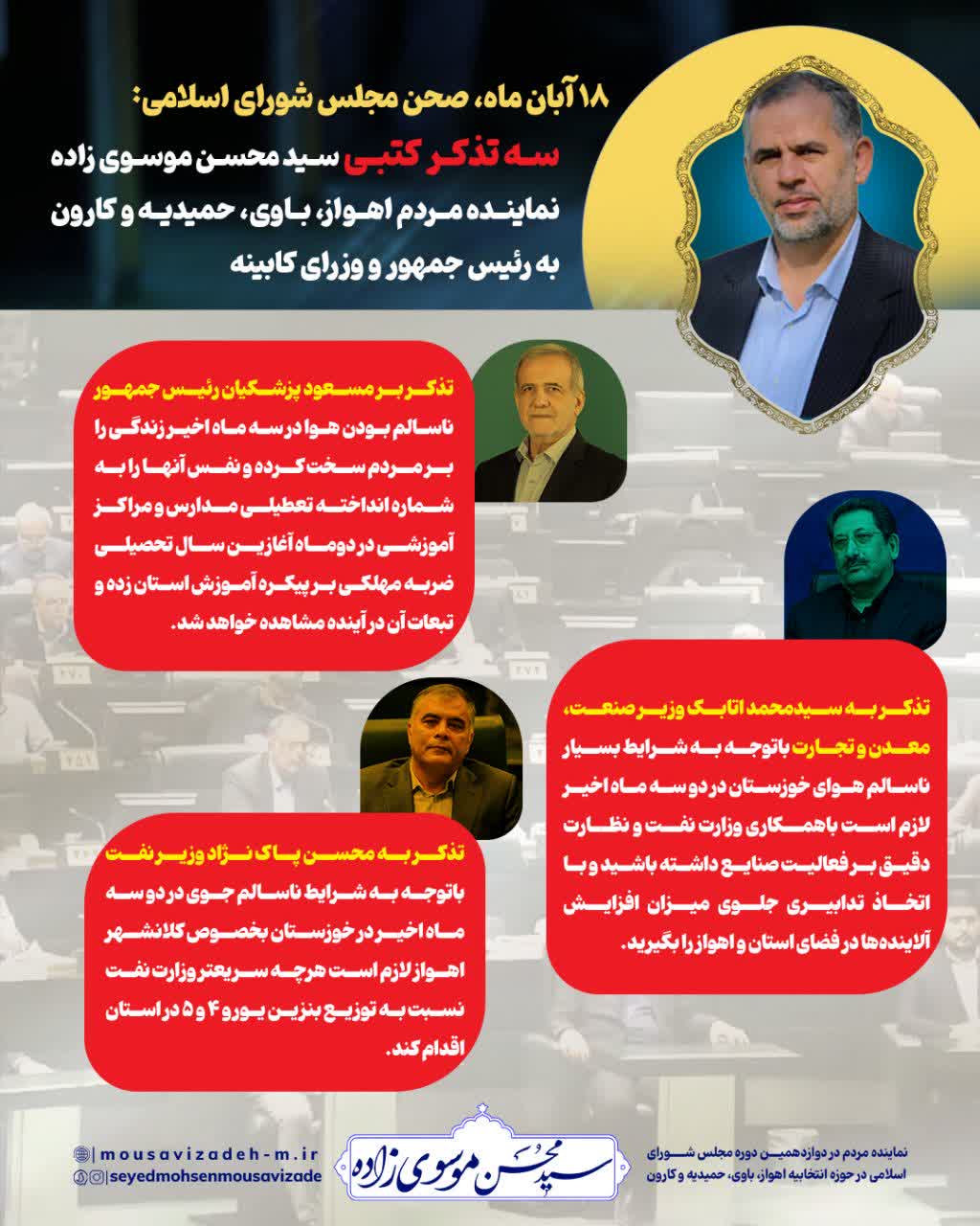 ۱۸ آبان ماه، صحن مجلس شورای اسلامی سه تذکر کتبی سید محسن موسوی زاده نماینده مردم اهواز، باوی، حمیدیه و کارون به رئیس جمهور و وزرای کابینه