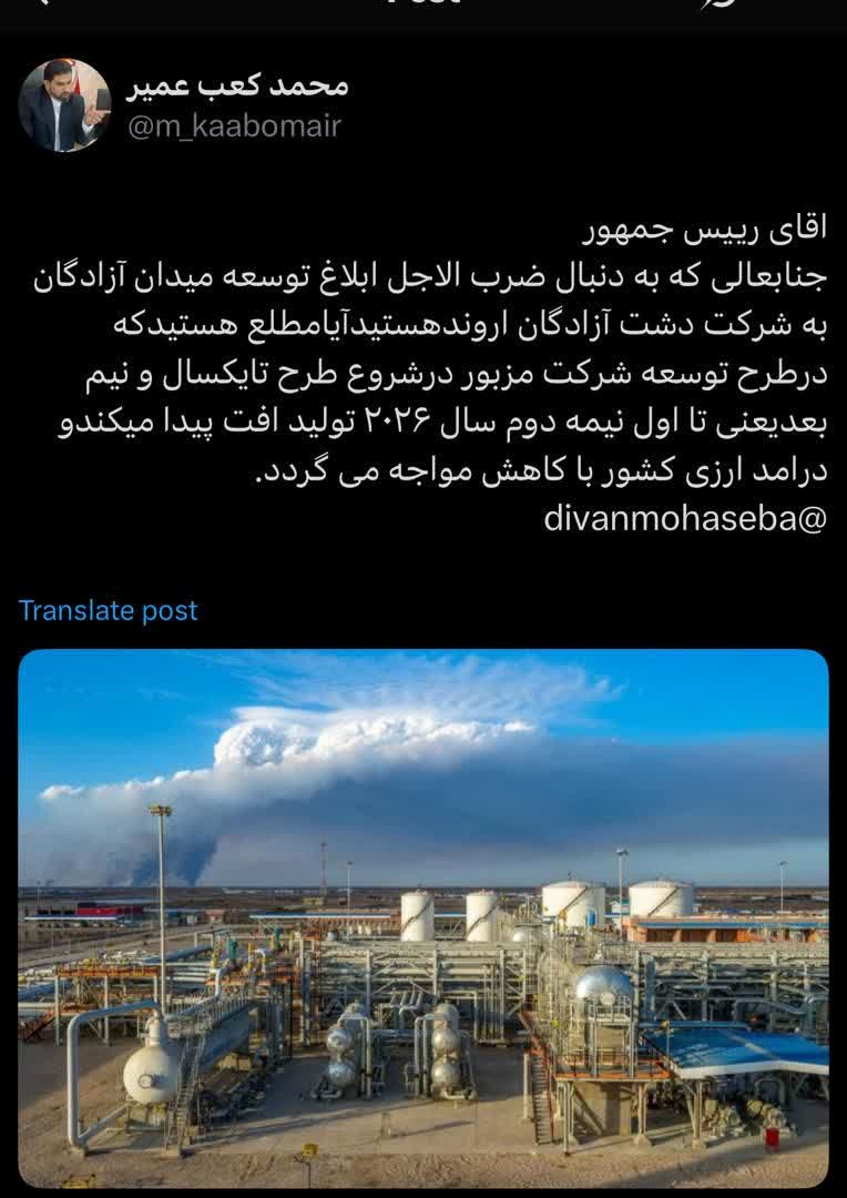 «آقای رئیس‌جمهور، جنابعالی که به‌دنبال ضرب‌الاجل برای ابلاغ توسعه میدان آزادگان به شرکت دشت آزادگان اروند هستید، آیا مطلع هستید که طبق طرح توسعه ارائه‌شده، از ابتدای اجرای پروژه تا حدود یک‌سال‌ونیم پس از آن — یعنی تا آغاز نیمه دوم سال ۲۰۲۶ — تولید میدان دچار افت خواهد شد و این موضوع به کاهش درآمد ارزی کشور منجر می‌شود؟»