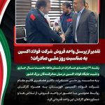 به مناسبت روز ملی صادرات، دکتر غضنفری قائم مقام شرکت فولاد اکسین خوزستان به همراه کارکنان روابط عمومی با حضور در واحد فروش و صادرات، از تلاش ها و دستاوردهای کارکنان این واحد قدردانی کرد.